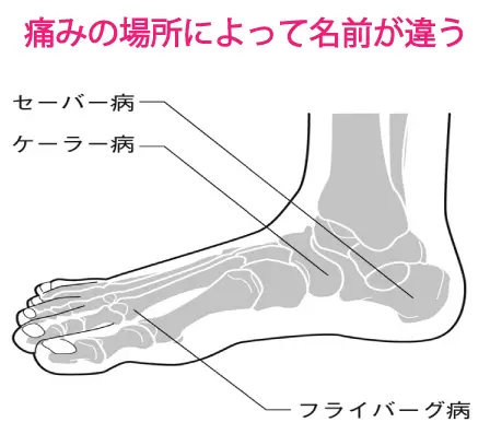 踵の骨後面にはアキレス腱が付着しているため、ジャンプやランニングなどにより、ここに牽引力が働くことで生じる骨端症です。この痛みは非常に強く、ひどくなると歩行だけでなく靴を履くことすら出来なくなります。